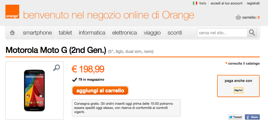 Motorola Moto G (2014) nella versione dual sim è disponibile all’ acquisto nello shop online Orange, al prezzo di 198,99 euro con spedizione gratuita.