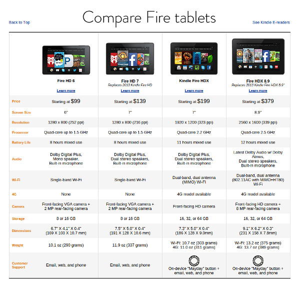 Il più interessante di tutti è probabilmente il nuovo Fire HD da 6” che, per 99$, ci permette di portare a casa un tablet con risoluzione 1280×800 con processore Quad-core a 1,5 Ghz, sicuramente un prodotto su cui Amazon punterà molto vista anche la nuova edizione Kids dedicata ai più piccoli.