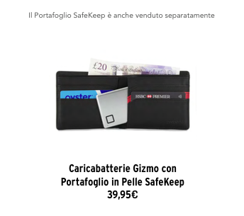 In aggiunta alla collezione di batterie portatili, abbiamo introdotto il nuovo Portafoglio in Pelle con tecnologia anti-RFID, ossia, un portafoglio che blocca la lettura delle vostre carte di credito in prossimità di lettori per i pagamenti senza contatto, e che può essere combinato al TurboCharger Gizmo, talmente sottile da poter essere conservato in un portafoglio”.