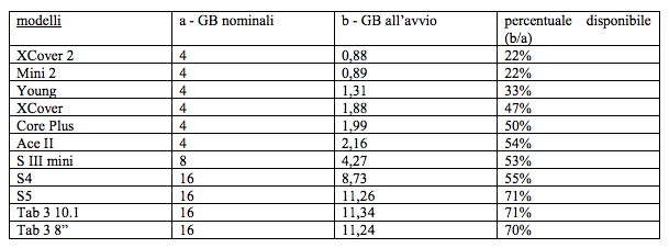 consumatore è significativamente inferiore a quella indicata: per alcuni modelli solo del 22% (il modello XCover 2 ed il Mini 2), per altri comunque solo di un terzo (lo Young al primo avvio dispone di 1,3 GB). Analogamente, anche per i modelli di smartphone di fascia alta, la memoria disponibile è significativamente inferiore a quella indicata. Infatti, per i modelli per i quali sono indicati al pubblico 16 GB di memoria, la percentuale della memoria effettivamente disponibile si attesta su valori compresi, secondo i dati forniti dal professionista, tra il 50% e poco più del 70% (quest’ultimo valore percentuale si registra nel caso del modello S5).