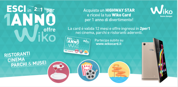 Infatti in occasione dell’arrivo sul mercato italiano del nuovissimo Wiko HIGHWAY STAR 4G, l’azienda francese di telefonia mobile lancia una speciale promozione attiva su tutti i principali punti vendita di elettronica: “Esci in 2×1 per un anno, offre Wiko”.