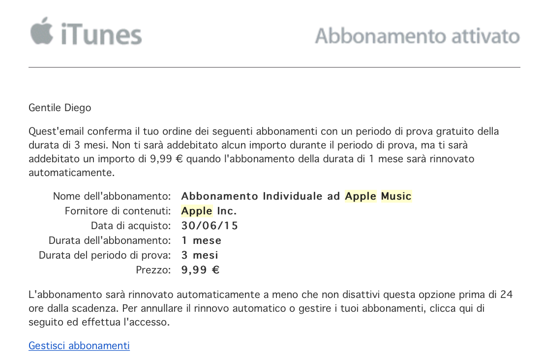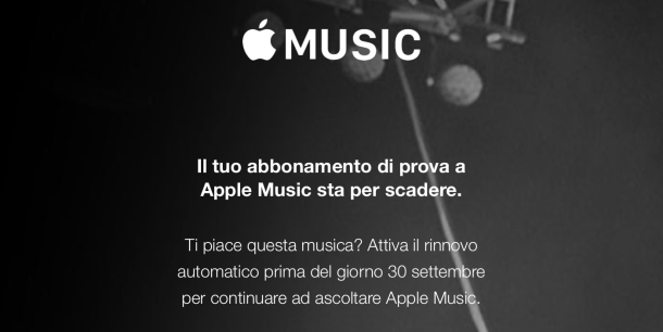 Se anche voi, come il sottoscritto, avete attivato il periodo gratuito di Apple Music, avrete ricevuto una mail da Apple con l’ avviso del termine del periodo di prova.