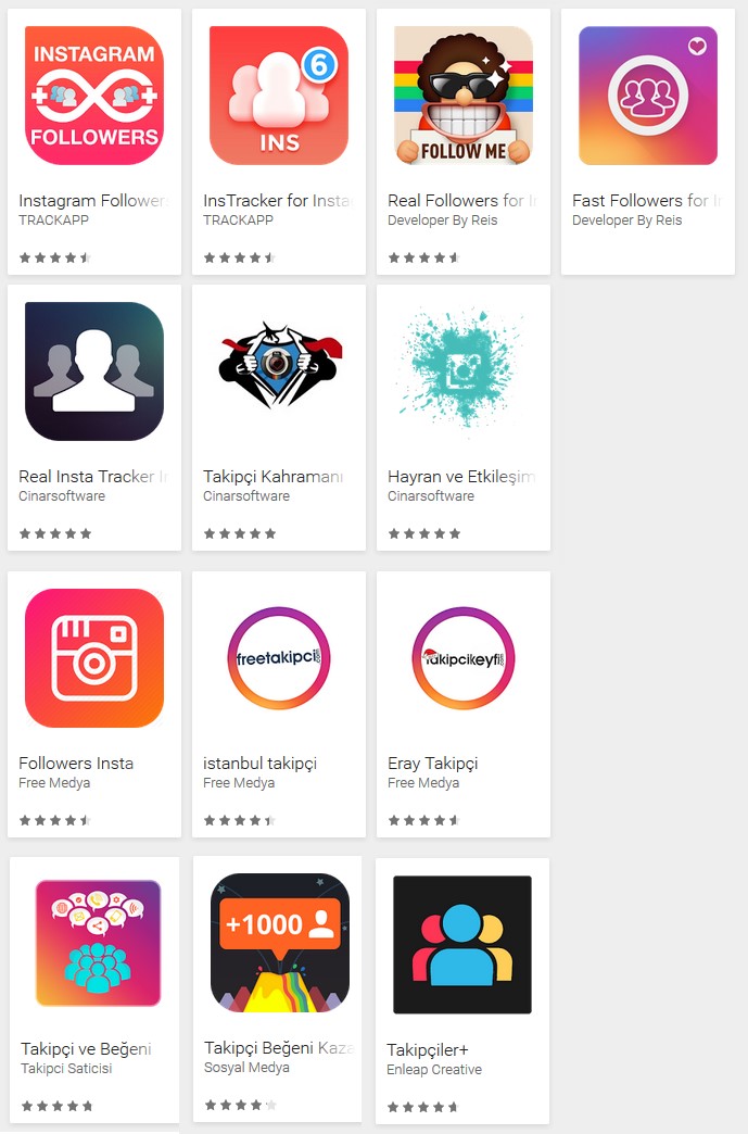 Individuate con il nome di Android/Spy.Inazigram, le app utilizzavano tutte la stessa tecnica di raccolta delle credenziali e di invio ad un server remoto: per invogliare gli utenti al download, le app malevole promettevano un incremento rapido dei followers, dei like e dei commenti sul proprio account di Instagram. Ironia della sorte, gli account compromessi venivano poi utilizzati per aumentare il numero dei seguaci di altri utenti.