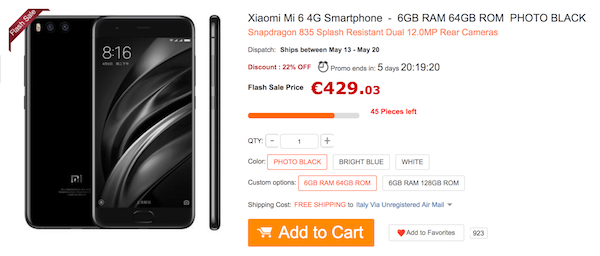 Xiaomi Mi6 da 128 GB colore Nero a 520 euro