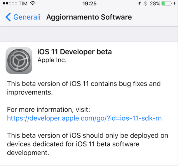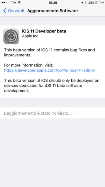 Al riavvio, andate su Impostazioni, generali, aggiornamento software e come per magia vi apparirà la nuova beta di iOS 11!