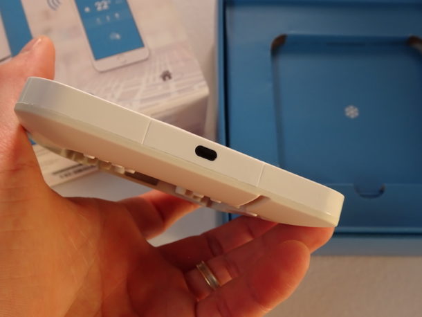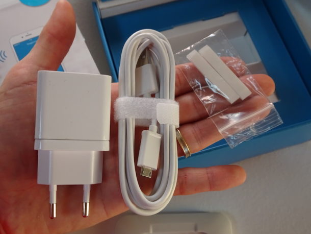 Nella confezione è presente il cavo Micro USB, l’alimentatore e due piccole strisce bi adesive per appenderlo al muro.