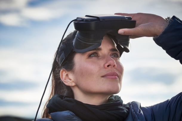 Come con un heads-up display, le informazioni di volo vengono poi visualizzate davanti agli occhi, all’interno del visore (ad esempio altitudine, velocità, distanza e livello della batteria).