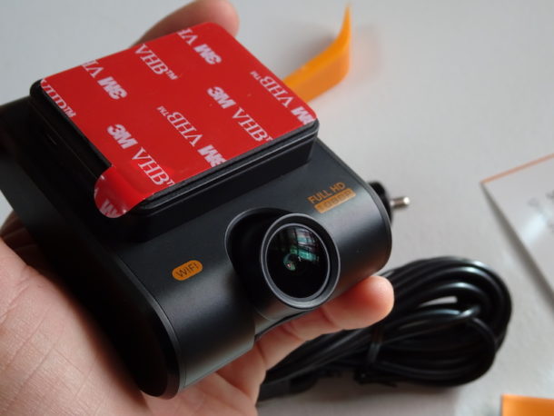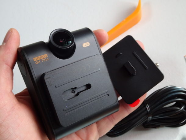 La scocca della dashcam è in metallo spazzolato, con inserti laterali in plastica scura.