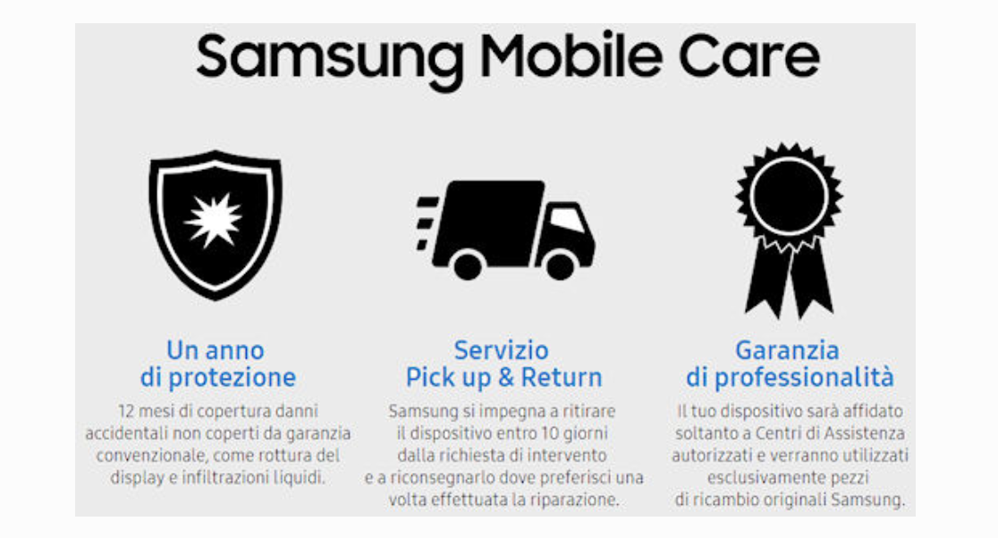 Samsung Mobile Care offre un’estensione della garanzia convenzionale, della durata di 12 mesi dalla data di acquisto, che mette a disposizione un intervento di riparazione da danno accidentale, con servizio di ritiro e riconsegna gratuita del dispositivo al domicilio indicato. Il valore di Samsung Mobile Care va da 79 a 129 euro, a seconda del modello di Smartphone a cui viene associato.