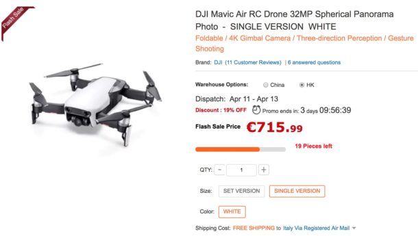 In offerta lampo a soli 714 euro, spedizione senza costi doganali, garanzia DJI riconosciuta e possibilità di attivare la DJI Care Refresh (prezzo ufficiale del drone 849€)