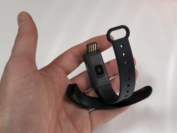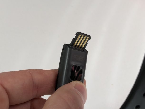 Per caricarlo bisogna rimuovere la parte del bracciale vicino al tasto capacitivo ed inserire la presa USB in un qualsiasi carica batteria o computer.
