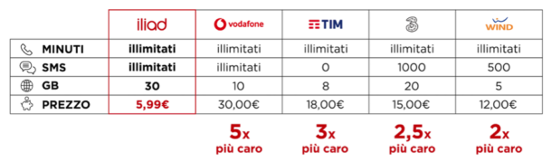 iliad lancia oggi la sua offerta di telefonia mobile: la più generosa sul mercato, con minuti e SMS illimitati e 30 GB / mese in 4G+ in Italia, minuti illimitati verso 65 destinazioni incluse, ecc. pur risultando cinque volte meno cara rispetto alle offerte dei concorrenti[1].