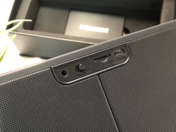 Tronsmart MEGA è tutto in plastica, con i comandi sensibili al tocco posizionati nella parte superiore e  gli ingressi con il pulsante di accensione posizionati nel retro.