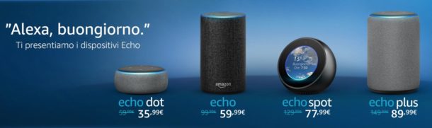 Amazon Echo, Echo Plus, Echo Dot, Echo Spot, Echo Sub e Amazon Smart Plug sono disponibili in pre-ordine a partire da oggi da http://www.amazon.it/echo.