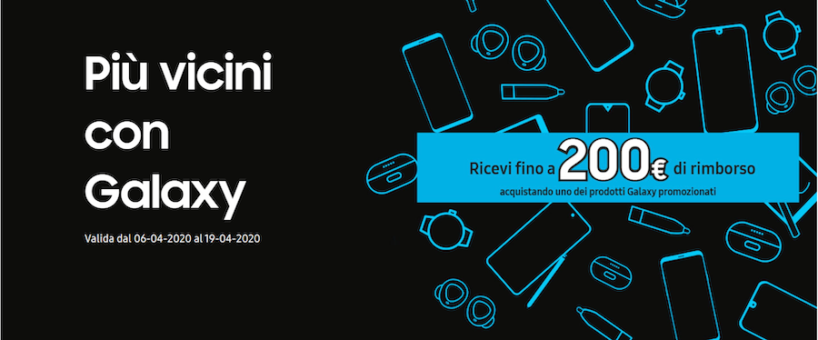 Samsung Electronics Italia annuncia il lancio della promozione Più vicini con Galaxy: da oggi, 6 aprile, al 19 aprile tutti coloro che acquisteranno presso i punti vendita e gli E-Store aderenti uno dei prodotti Galaxy in promozione avranno la possibilità di ricevere fino a 200€ di rimborso.