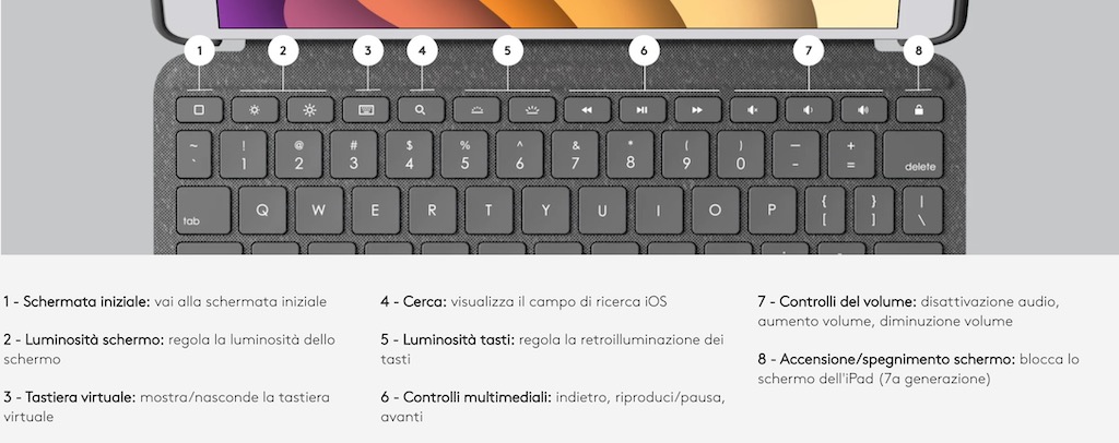 Ha una fila completa di tasti dedicata alle scorciatoie di iPadOS, per accedere al volo a schermata Home, Siri, Cerca, controlli multimediali e altro.