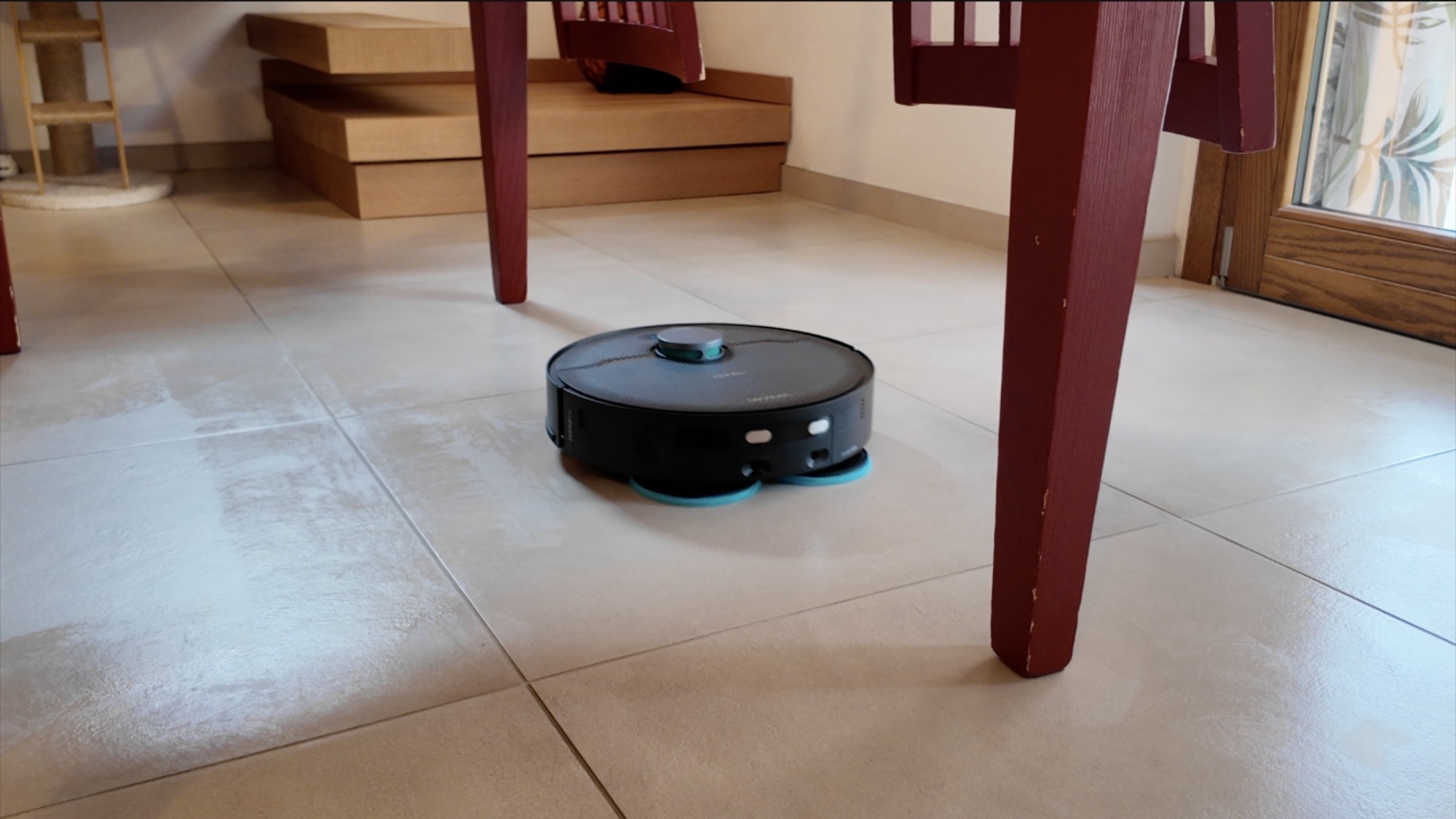 Il lavaggio è uno dei suoi punti forti. Il movimento dei due mop rotanti è efficace e il robot si muove con una logica ben studiata. Dopo ogni ciclo, la base lava i mop con acqua pulita e poi li asciuga con aria calda, pronta per il prossimo utilizzo.