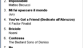 Stamani ho acquistato alcuni brani da iTunes e scrutando la Top Ten dei singoli più venduti in Italia, possiamo notare che le prime 8 posizioni sono occupate interamente dai brani del format TV X Factor! In vetta alla Top Ten ci sono i “Bastardi”, con Matteo secondo e Jury terzo. …