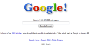 Google sta festeggiando il suo decimo compleanno con molte iniziative, una delle più curiose è una pagina dedicata con il motore di ricerca fermo al 2001!! Potete effettuare le ricerche fino al 2001!! Cercate le parole tipo Nokia, iPod ( non esisteva), Omnitel!!! Avete trovato qualcosa di curioso?