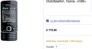 Il sito SpazioCellulare.com, segnala la resenza del Nokia N96 in uno store tedesco, Otto.De Il prezzo mi sembra a dir poco assurdo 779,90 euro!! Data di uscita Agosto.. Non ci resta che attendere…avrà i contatti in oro questo N96?? 😀 {IMU_728_90}