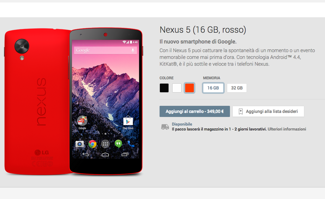 Dopo diverse immagini leaked e speculazioni, il Nexus 5 nella colorazione rossa è disponibile all’ acquisto nello shop online di Google. Il prezzo è il classico di 349 euro per la versione da 16 GB e 399 euro per la versione da 32 GB.