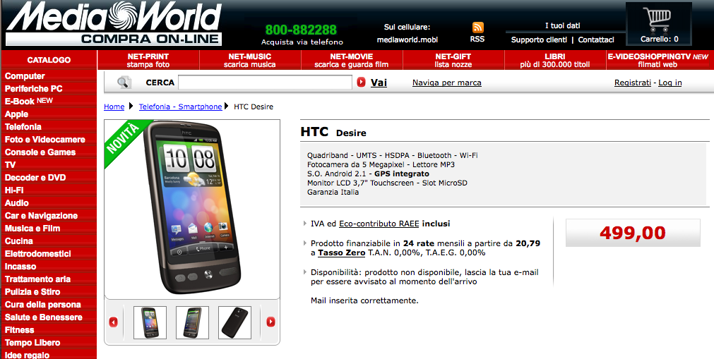 I negozi OnLine più blasonati hanno messo a listino i nuovi gioelli di HTC. In questo caso vediamo mediaworld Il prezzo medio in rete è di : Htc Legend : 399 euro HTC Desire : 499 euro La disponibilità è prevista nella prima settimana di Aprile.