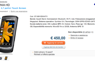Finalmente il tanto atteso mostro Samsung OMNIA HD inizia a fare capolino negli store OnLine! Lo si può ordinare in anteprima sul sito MonClick al prezzo molto vantaggioso di 450 euro!! Attualmente non vi sono informazioni sulla effettiva disponibilità {IMU_468_60}