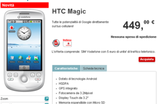 Finalmente il tanto atteso HTC Magic è disponibile nello shop Vodafone! Il prezzo è di 449€ senza obbligo di contratto, altrimenti vi sono le offerte (poco vantaggiose a dire la verità) per averlo con un abbonamento {IMU_728_90}