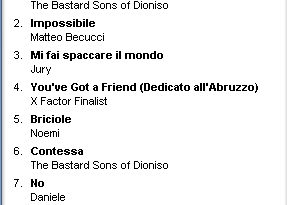 Stamani ho acquistato alcuni brani da iTunes e scrutando la Top Ten dei singoli più venduti in Italia, possiamo notare che le prime 8 posizioni sono occupate interamente dai brani del format TV X Factor! In vetta alla Top Ten ci sono i “Bastardi”, con Matteo secondo e Jury terzo. …