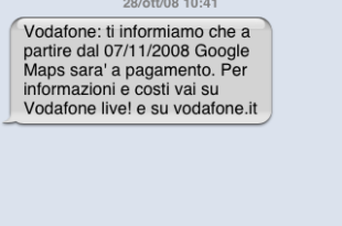 Cerchiamo di fare un pò di chiarezza sulla questione Vodafone e Google Maps!!Ieri ho ricevuto questo SMS Oggi Ricky mi segnala un intervento sul suo blog escludendo gli utenti che usano iPhone, dal 7 Novembre si pagheranno 29 cent per ogni primo accesso a Google Maps, più 1€ ogni 15 …