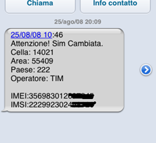 Ciao raga, ultimamente mi succede questo. Ricevo sistematicamente un sms con scritto questo testo: Attenzione SIM cambiata Cella 14021 Area 55409 Paese 222 Operatore TIM IMEI xxxxxxxxxxxxxxxxxx IMSI xxxxxxxxxxxxxxxxxxxxxxxxxxxxx Numero di telefono Probabilmente si tratta del programma Guardian installato su qualche Nokia Seire N!! La domanda è: Come mai arriva …
