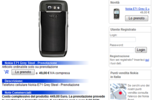 L’ amico Mauikek from SymbianPlanet, pubblica questa interessante notizia. Il nuovo Terminale Serie E Nokia E71 ha fatto capolino sul Nokia Store Italiano! Da oggi è prenotabile versando una caparra di 49€, e il prezzo del telefono è di 449€.. Sinceramente me lo aspettavo ad una cifra inferiore, 400€ – …