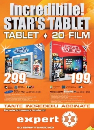 Eccomi nuovamente a proporvi un volantino davvero interessante, il tema di quest’oggi è Tablet+film tutto in uno. Infatti nel volantino Expert avrete la possibilità di acquistare singolarmente oppure associato ad un prodotto lo “Star’s Tablet”: una combo di Tablet + 20 films tutto insieme. Link al volantino dopo il salto: