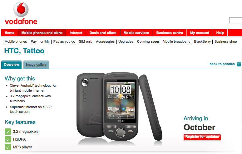 Copaccio del gestore Vodafone UK. Il nuovo HTC Tattoo, terminale entry level con ANDROID, è apparso nel sito di Vodafone UK! Il suo arrivo è stimato per il mese di Ottobre 2009 E in Italia?