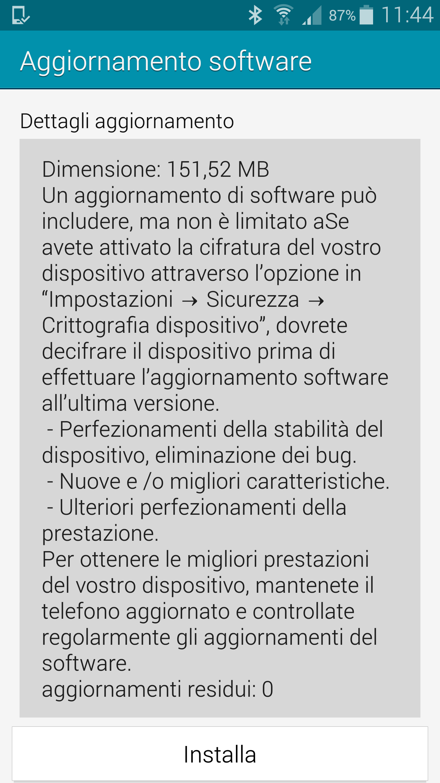 Samsung Italia ha rilasciato un nuovo aggiornamento firmware per il Galaxy Note 4. La versione è la N910FXXU1ANK5 e il peso è di circa 152 mb.