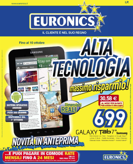 Il Samsung Galaxy Tab costerà 699 euro e il prezzo è ufficiale. La catena di elettronica Euronics lo avrà disponibile in anteprima il 1 ottobre 2010. A Presto.